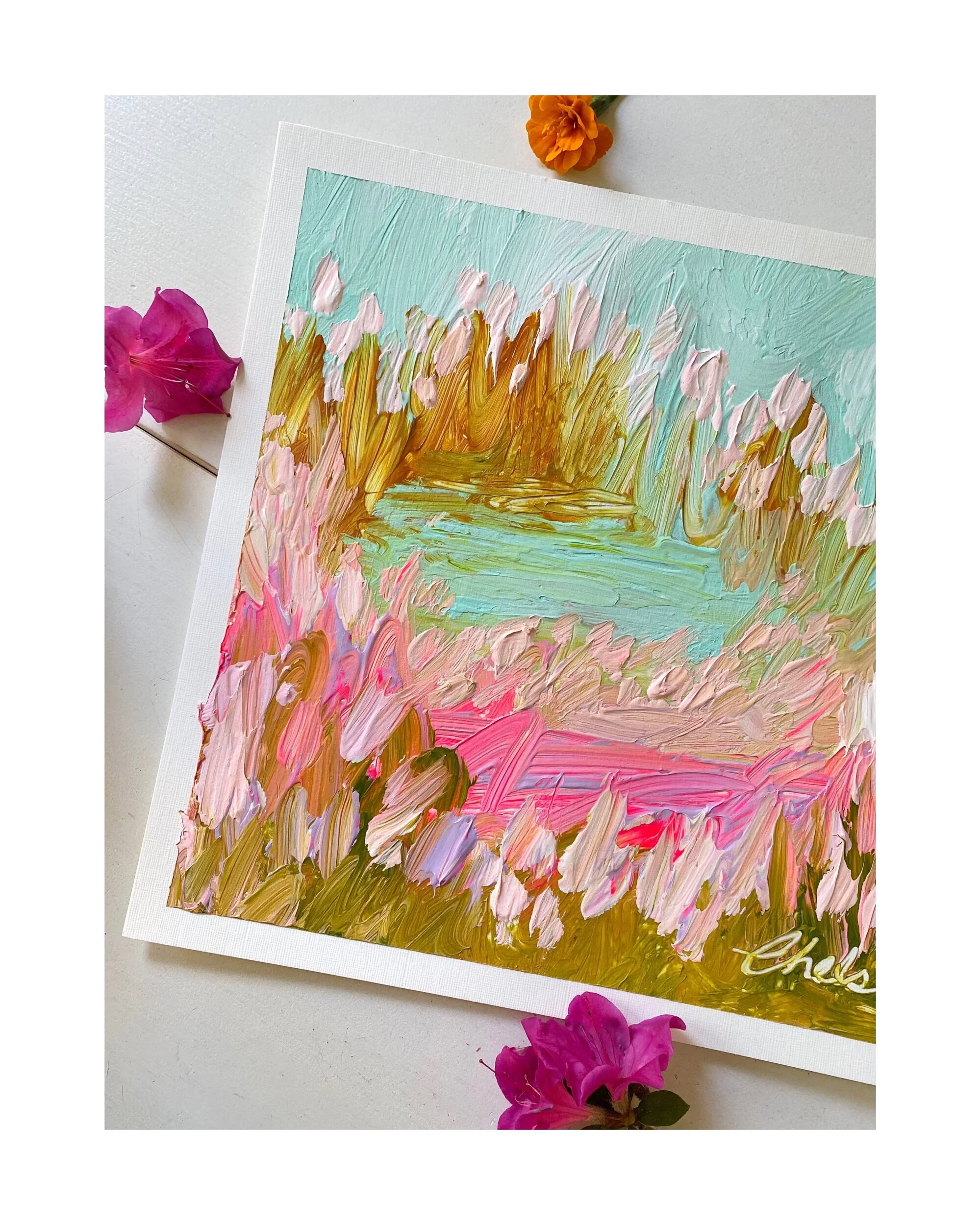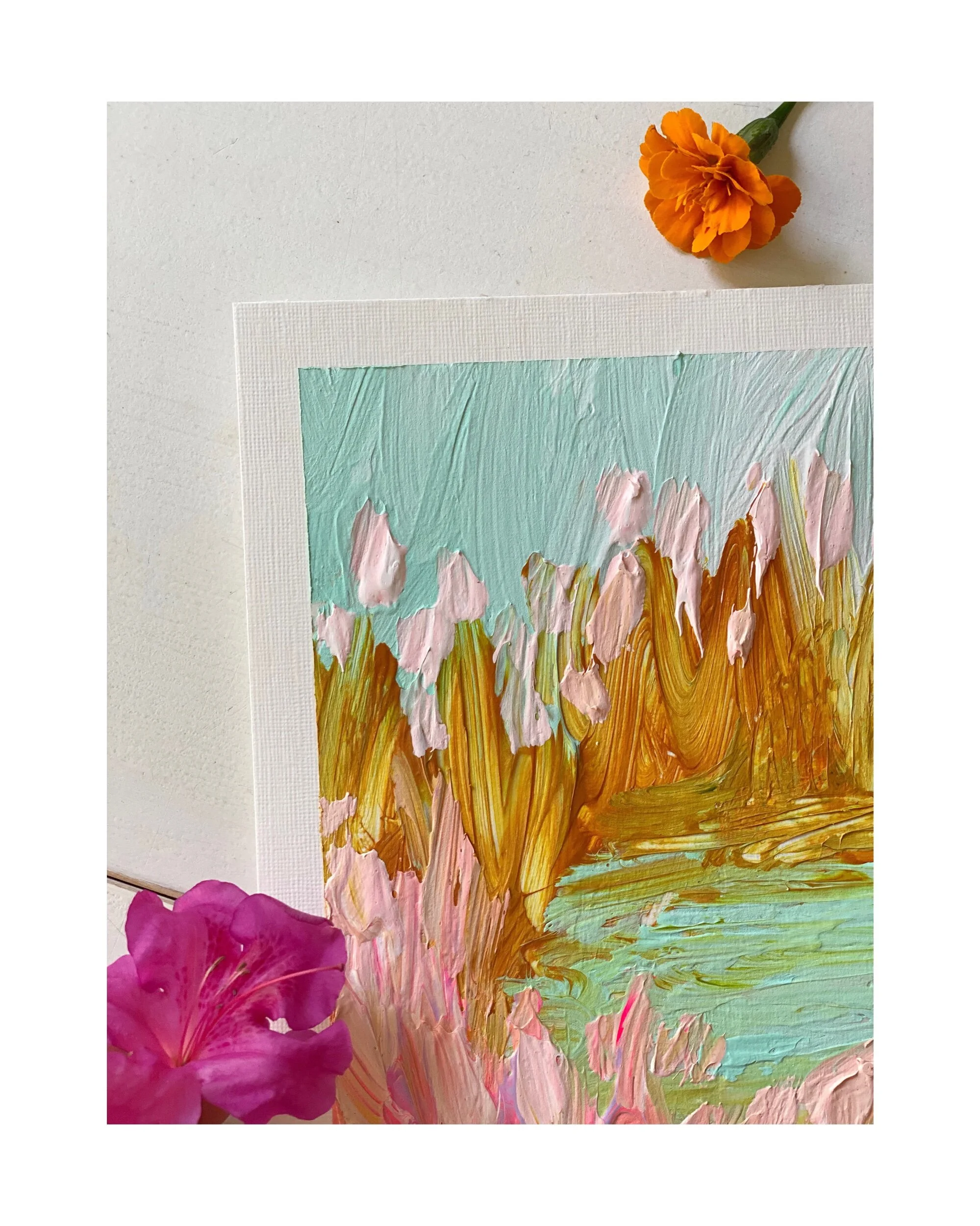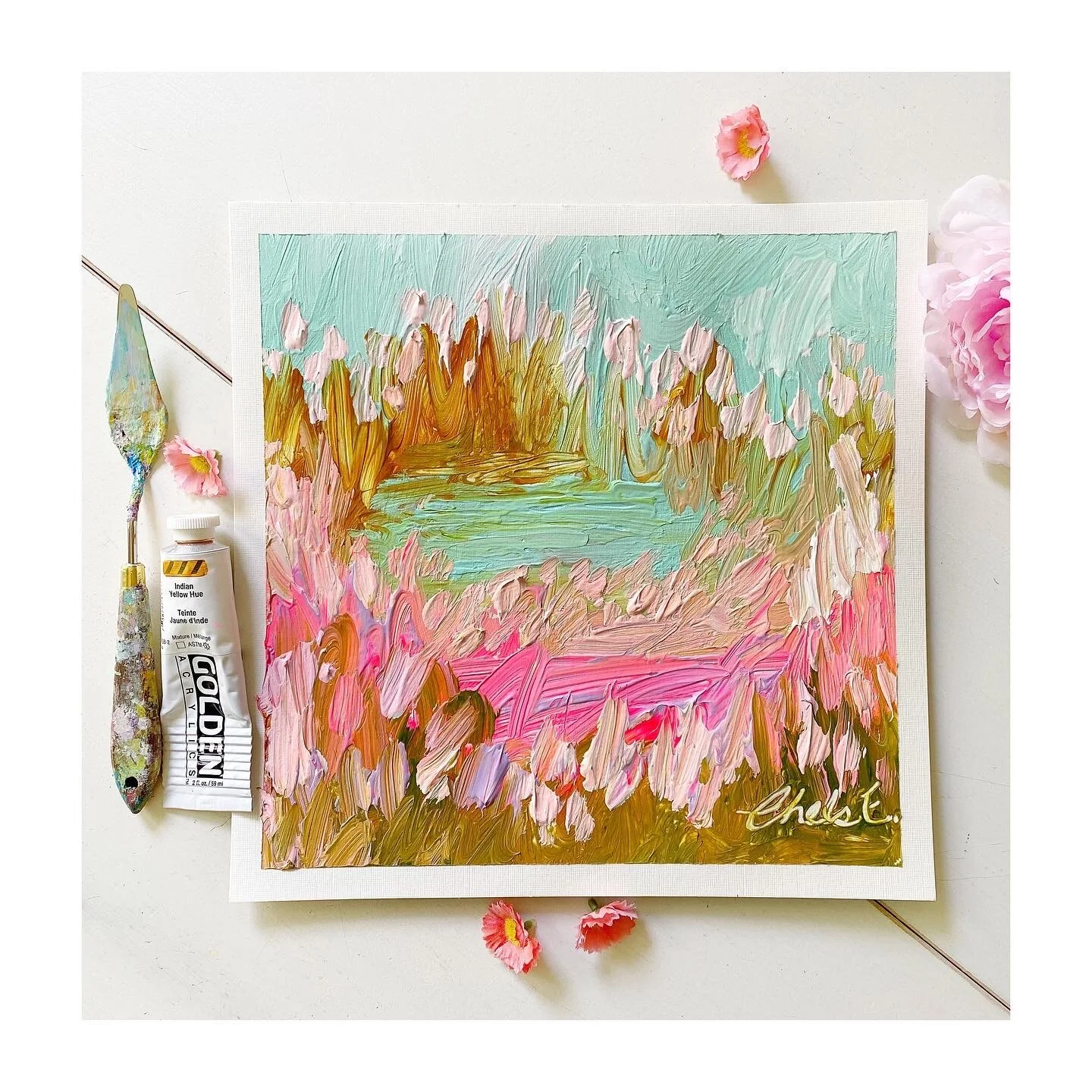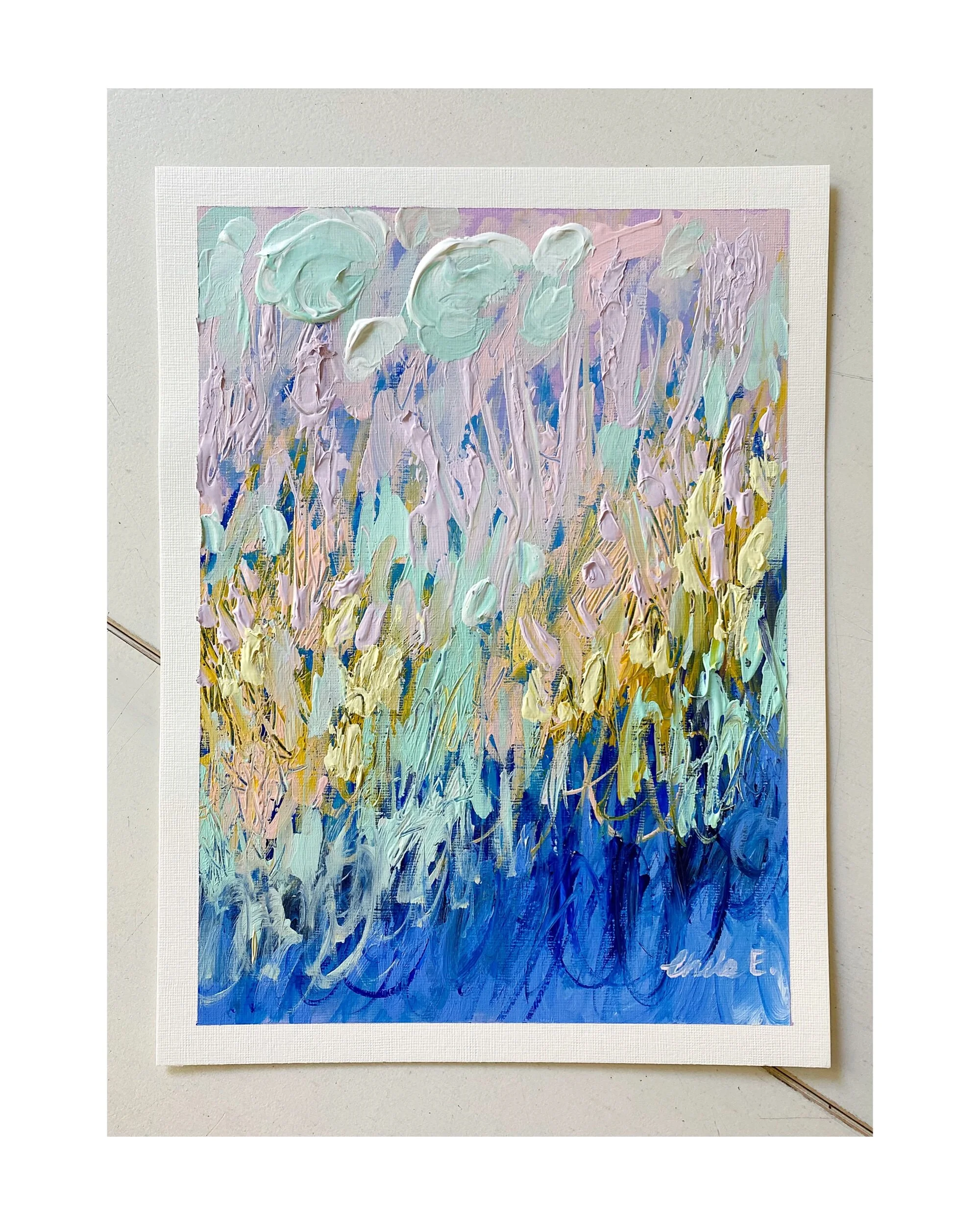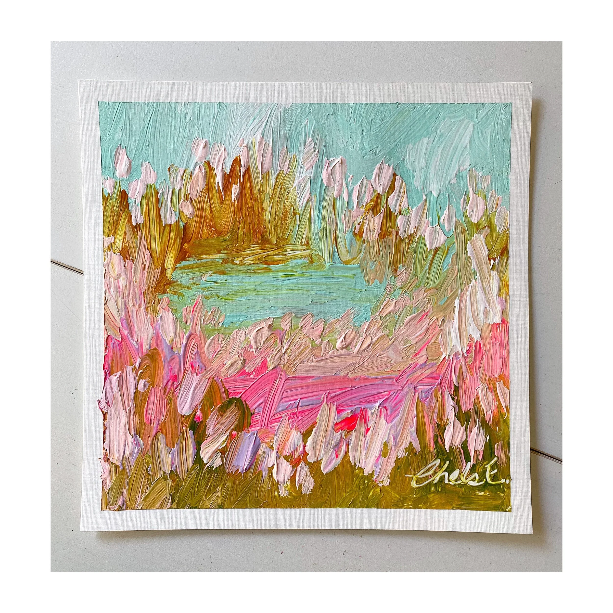 My paper landscapes are created mainly with my palette knife and luscious heavy body acrylics on Arches 300lb paper. I only use high qulaity products in each creation.